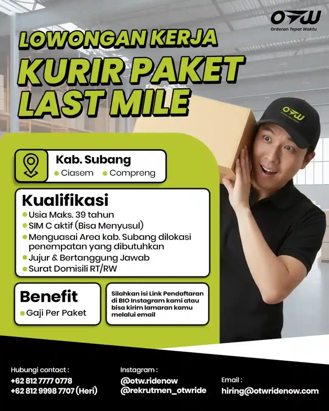 OTW RideNow kembali membuka kesempatan bergabung sebagai Kurir Last Mile untuk wilayah Kabupaten Subang. Posisi ini sangat cocok bagi Anda yang menyukai pekerjaan lapangan, memahami wilayah Subang, serta memiliki komitmen tinggi terhadap ketepatan pengantaran.